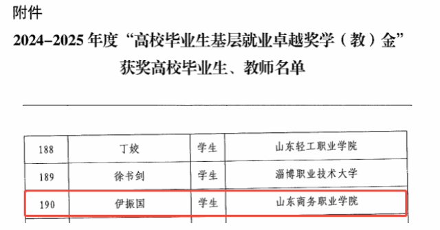 近日,“高校毕业生基层就业卓越奖学(教)金”奖励委员会正式公布2024-2025年度全国获奖人选,我校学子伊振国凭借在基层岗位的突出表现光荣上榜。这是我校首次斩获该项殊荣,标志着学校在基层就业人才培养与典型培育工作中取得历史性突破,为学校就业工作高质量发展写下浓墨重彩的一笔。据悉,此次评选全国获奖学生共有418名,山东省高校(含本科)获奖毕业生共23名,分别来自13所本科院校(含民办),1所职业本科院校,以及9所专科院校。
