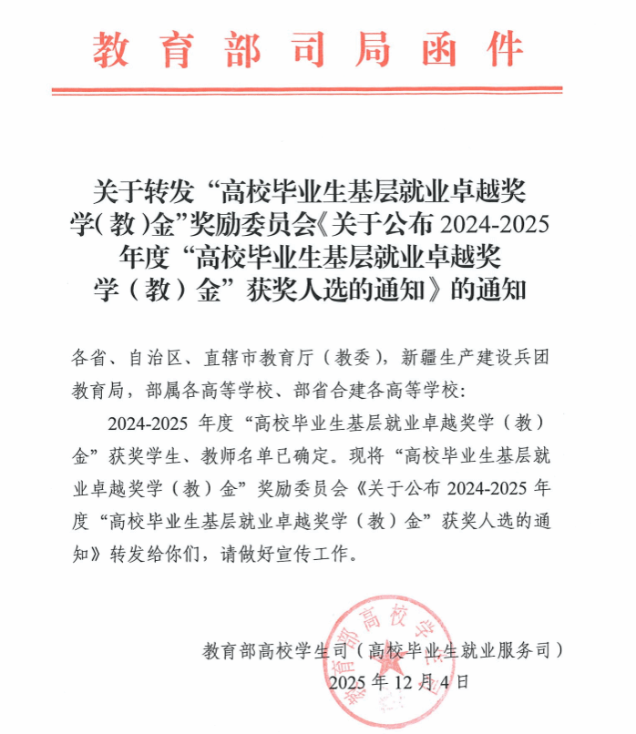 作为国家引导高校毕业生服务基层的重要激励奖项,“高校毕业生基层就业卓越奖”旨在表彰将个人理想融入国家发展大局,在基层一线建功立业的优秀高校毕业生。伊振国同学的获奖,是对其扎根基层、实干担当精神的高度肯定,更是学校多年来深耕就业育人、重视基层就业引导工作的成果彰显。