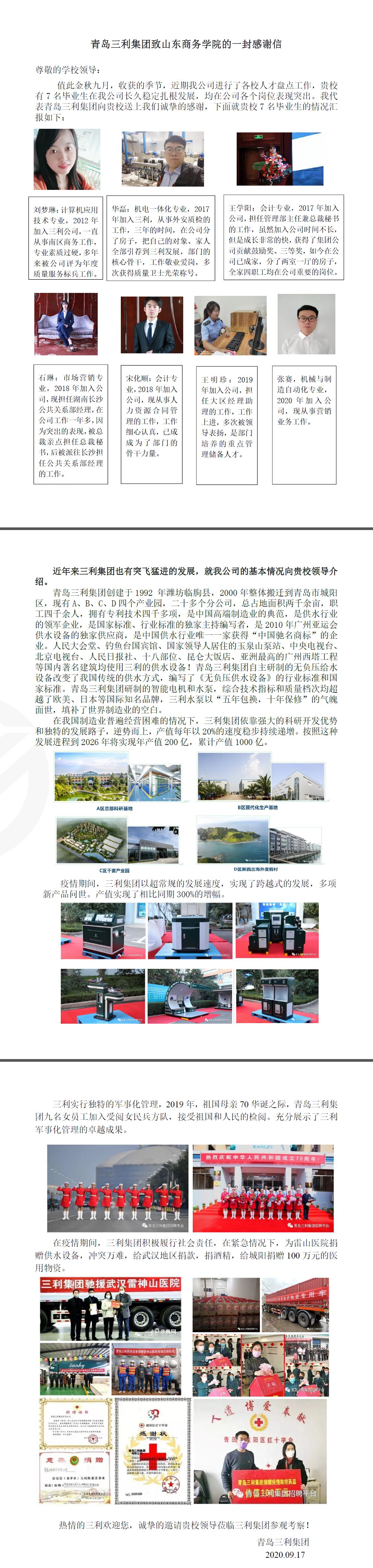 9月17日,我校招生就业处收到了来自青岛三利集团有限公司的感谢信。青岛三利集团是国内供水行业的领军企业,是国家标准、行业标准的独家主持编写者,是中国供水行业唯一一家获得“中国驰名商标”的企业,也是学校的招聘合作单位。我校计算机应用技术专业刘梦琳、机电一体化专业华磊、会计专业王学阳等7位毕业生表现优异,赢得了公司高度好评,特来信对学校和老师表示感谢!