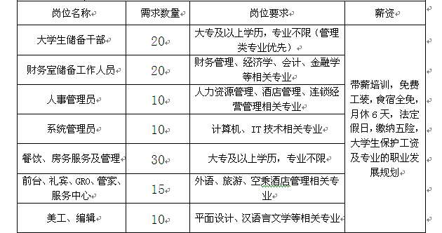 已毕业大学生: 本科及以上学历毕业生入职即为储备领班,大专学历毕业生入职满3个月考评合格即为储备领班,当酒店范围内或集团范围内出现岗位空缺时,储备领班经考评合格即可晋升为领班岗位。