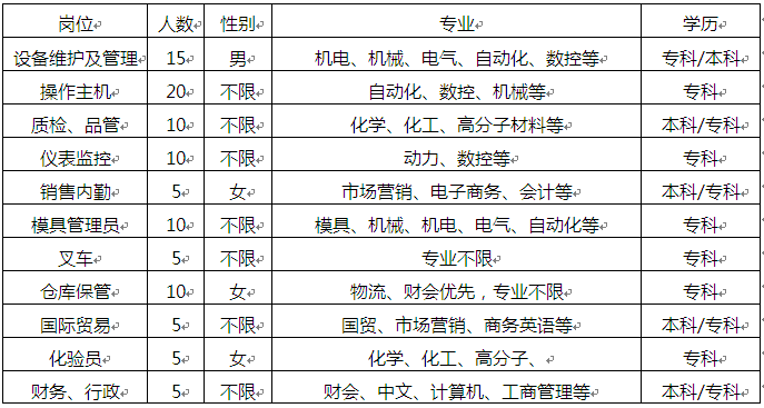 B、招聘专业:橡胶工艺、高分子、化工、化学、机电一体化、机械、数控、模具、自动化、市场营销、国际贸易、计算机、财务等其他专业。