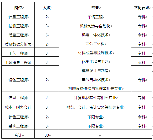 根据公司全球化发展的需求,公司需要招聘优秀人才,充实到技术、质量、工艺、制造、设备、模具设计、采购、销售、物流、管理等岗位,发展成为技术领军、质量领军、制造领军等,并让正知、正念、正行的每个人都能跟随公司发展,成就自我。
