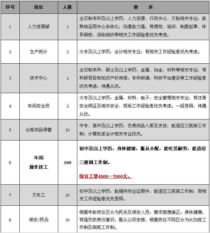 因公司产能扩大,现面向社会公开招聘如下岗位: