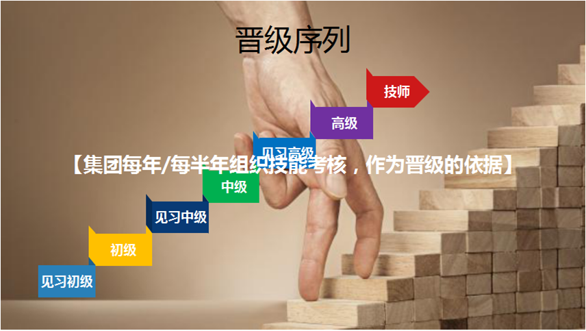 集团每年定期组织1-2次业务技能的考核,技能考核覆盖所有员工,考试合格者可给予晋级,每次晋级都伴随着薪资待遇的进一步提升。