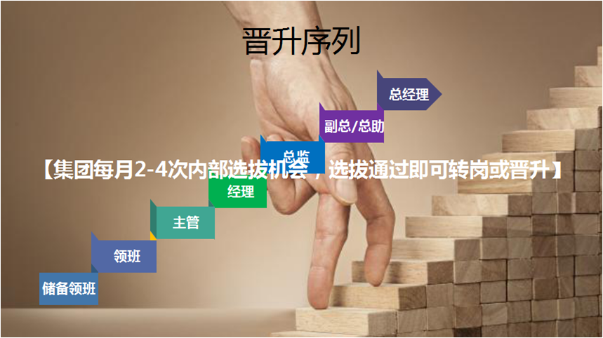 致力于在集团稳定发展的员工,一般1年左右的时间可成长为领班,2-3年的时间可成长为经理、总监,表现优秀者4年左右的时间可成长为总经理助理、副总经理。