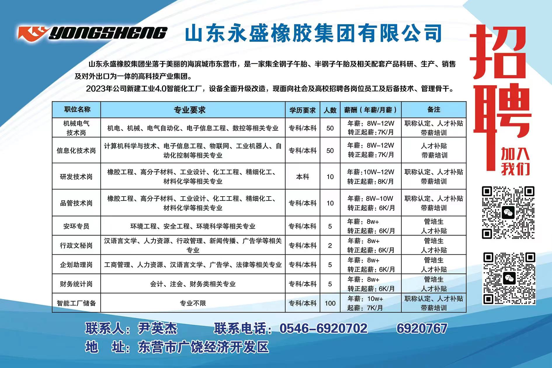 山东永盛橡胶集团有限公司1986年成立,是一家集全钢子午胎、半钢子午胎及相关配套产品科研、生产、销售及对外出口为一体的高科技产业集团。公司连续六年轮胎行业出口创汇东营市第一,山东省橡胶类企业对外贸易第三名,现有员工5000多人。