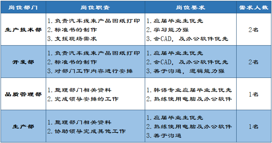 “烟台泰星汽车部品有限公司”(YanTai Taesung Automotive Parts Co.,LTD)系“韩国泰星电装株式会社”(http://www.tecstar.co.kr)在烟台市莱山经济开发区投资兴建的独资外企,现因规模增加,需招收办公室人员6名,凡达到以下用工标准均可报名: