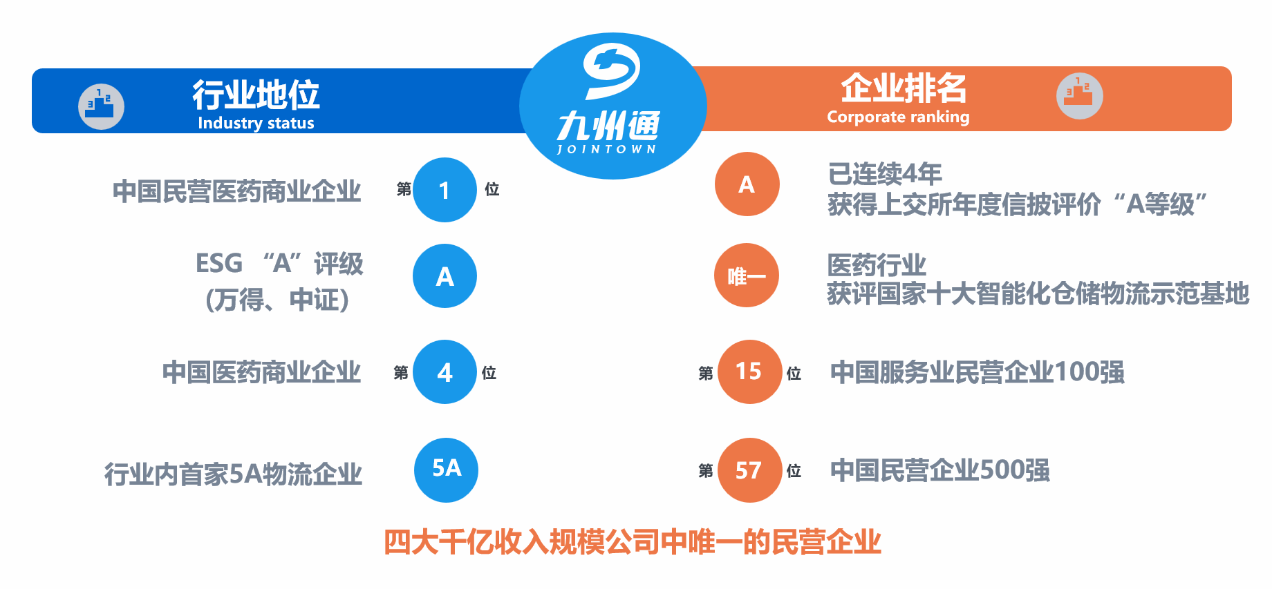 九州通医药集团股份有限公司 (SH:600998)注册资本18.79亿元,总资产575.89亿元, 员工2万余人,是中国医药商业领域具有全国性网络的少数几家企业之一,连续多年位列中国医药商业企业第四位,中国民营医药商业企业第一位,在中国民营企业500强中位列第57位,是四大千亿收入规模公司中唯一的民营企业。九州通以 “呵护民众健康,常让客户惊喜,打造合作共赢平台”为企业使命,为医药健康产业提供高性价比服务。