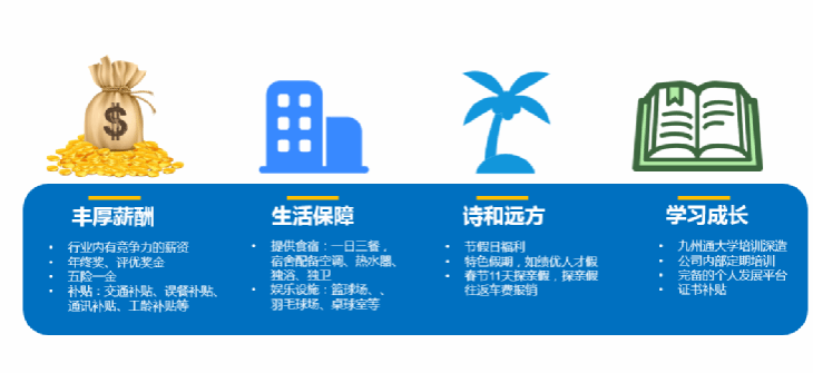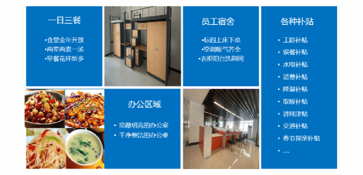 食宿保障:免费食宿 (宿舍四人间上床下桌, 独卫暖气空调设施齐全, 食堂一日三餐免费提供),法定节假日按规定休息,缴纳五险一金及意外险。