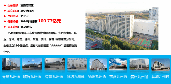 山东九州通医药有限公司是一家以西药、中药、医疗器械为主要经营产品,以医疗机构、 批发企业、零售药店为主要客户,为客户提供专业的医药分销、总代总销、现代物流、信息技术等各项服务的大型企业。公司成立于2004年8月,注册资金11亿元, 总资产33.45亿元、员工1500余人,经营品种1.2万余种,2024年销售额突破100.77亿元。