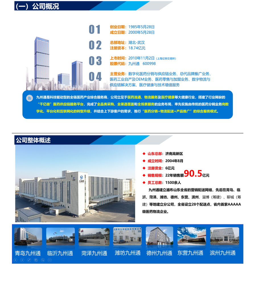山东九州通医药有限公司是一家以西药、中药、医疗器械为主要经营产品,以医疗机构、批发企业、零售药店为主要客户,为客户提供专业的医药分销、总代总销、现代物流、信息技术等各项服务的大型企业。公司成立于2004年8月,注册资金6亿元,总资产33.45亿元、员工1500余人,经营品种1.2万余种,截至2022年12月31日,2022年实现营业收入90.5亿元。