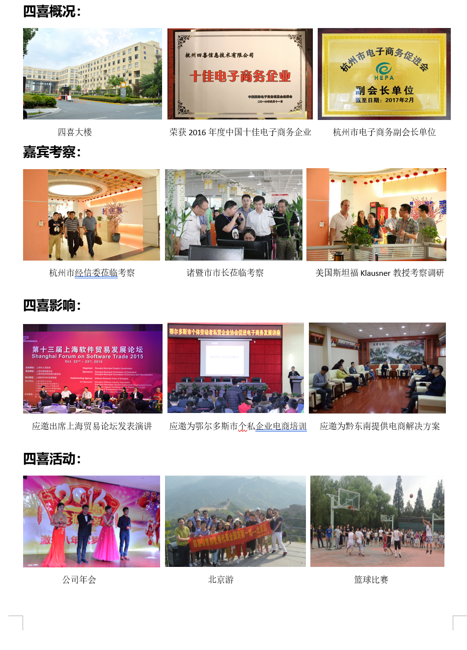 杭州四喜信息技术有限公司是目前国内电子商务托管领域的领航者。公司成立于2008年,目前拥有员工1000余人,总部坐落于杭州市西湖区,分公司位于山东临沂,浙江建德及浙江诸暨,自公司成立以来为近30000家企业提供企业商铺装修、电商托管、电商代运营及企业SAAS软件等服务,解决电商销售难题,实现互惠互利,互补双赢,共走成功之路。