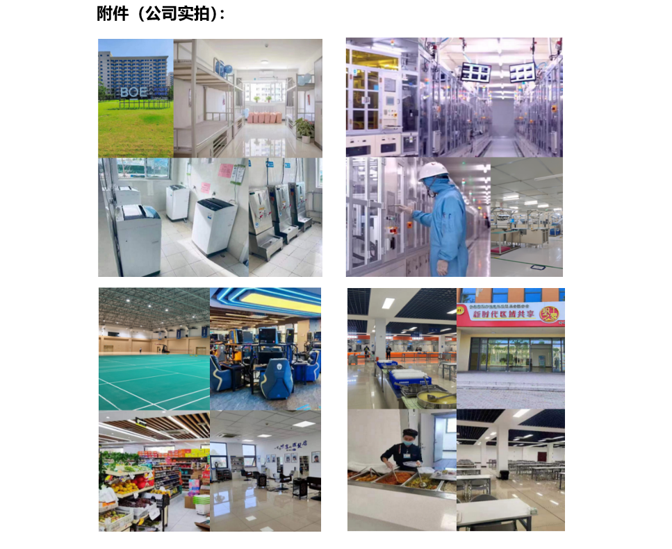 青岛京东方光电科技有限公司由京东方科技集团投资建设,一期总投资81.7亿元,占地面积808亩。其中500亩用于生产制造,300亩做为生活区,配套非常齐全。建有11栋宿舍楼,4-6人间,独立阳台独立卫浴,24小时热水免费水电,免费WiFi,超市、食堂、活动中心综合楼,各类球场、台球室、KTV、电竞室、舞蹈室、理发店、图书室...满足员工日常生活。